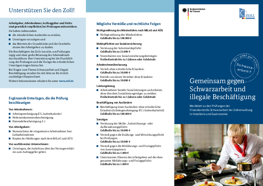 Gemeinsam mit dem Bundesfinanzministerium, der Finanzkontrolle Schwarzarbeit und der Gewerkschaft NGG hat der DEHOGA ein Merkblatt zu den Prüfungen der Finanzkontrolle Schwarzarbeit der Zollverwaltung in Hotellerie und Gastronomie herausgebracht.